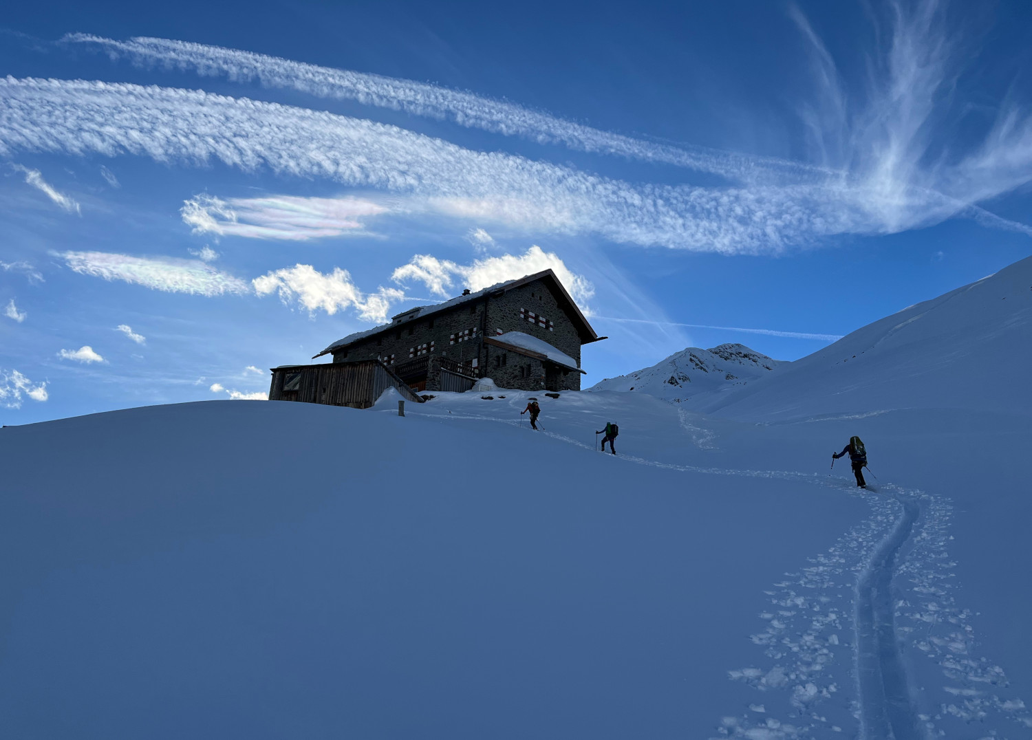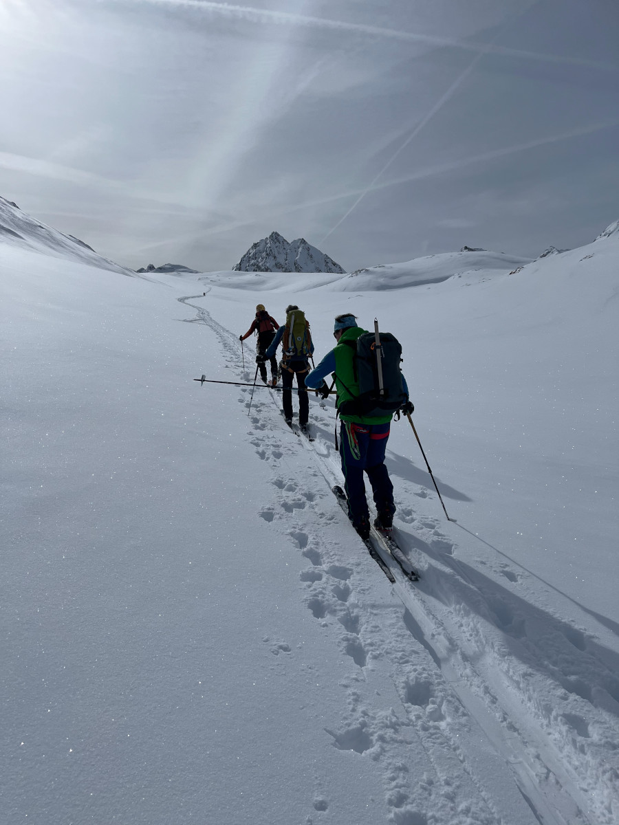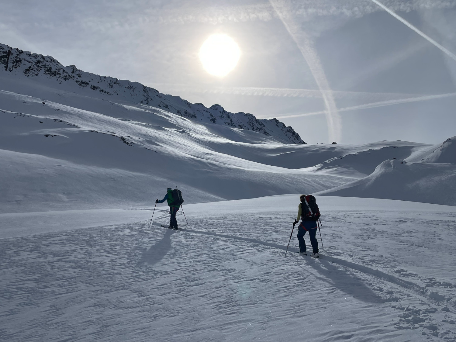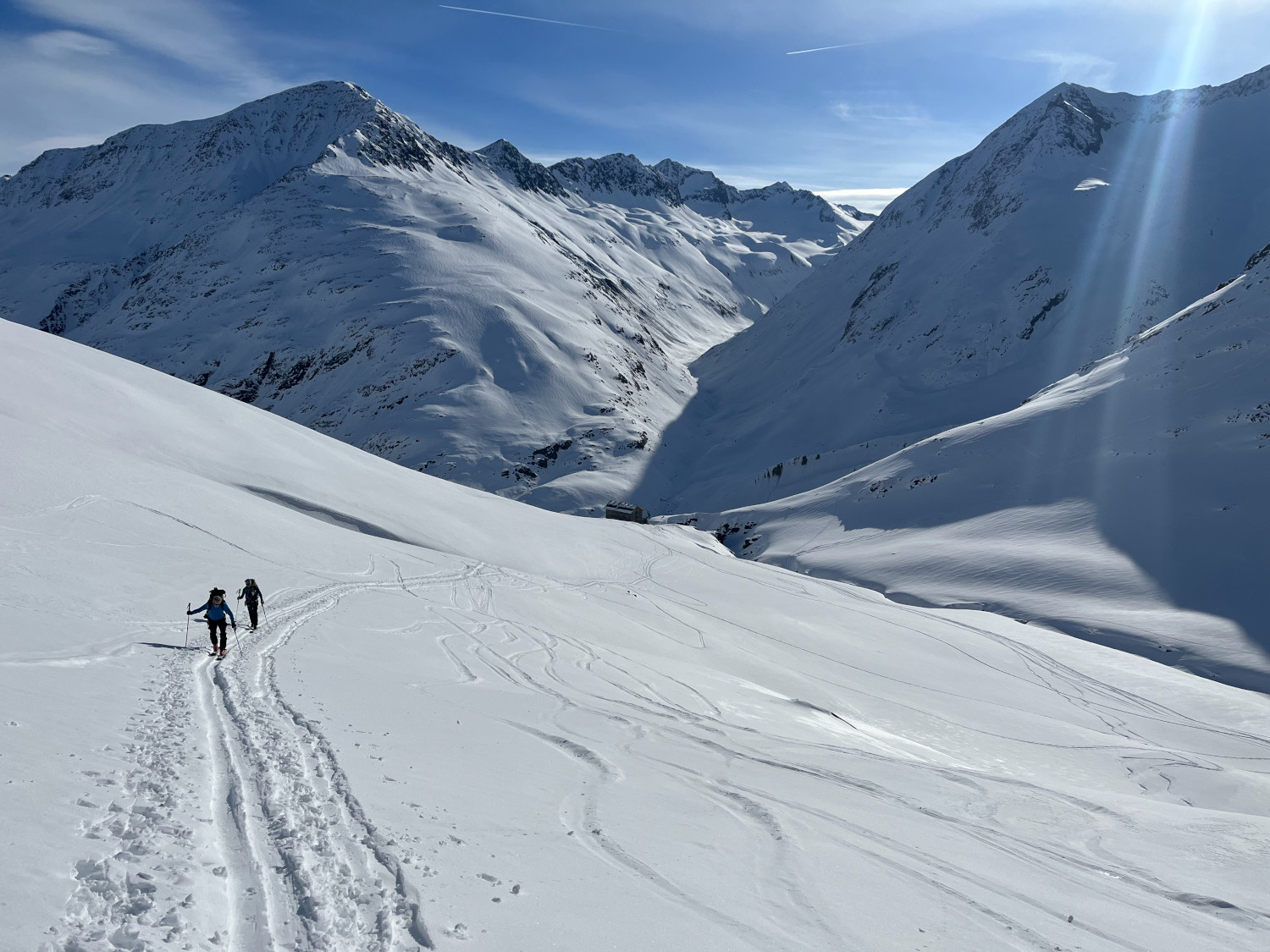 4 Tage Skitransalp-Feeling, wobei die Durchquerungsetappe in diesem Format so gewählt ist, dass sie mit einer durchschnittlich/guten Kondition (ca. 1200 Höhenmeter im Aufstieg / Tag; mit einem Rucksack, in dem wir alles mittragen, was wir für diese Tage mithaben) und sicheren Skitechnik gut zu meistern und damit auch zu genießen ist. Ein Skitouren-Abenteuer auf den Spuren der Skitransalp, das dir viele besondere Momente in der winterlichen Bergwelt zugänglich macht, die sich uns gerade deshalb zeigen, weil wir die Linien der gängigen Skitouren verlassen…